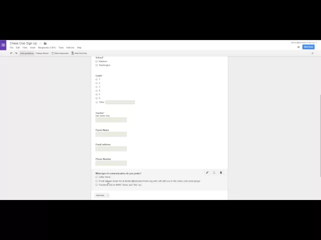 Recommended Video: Create an Online Permission Form Using Google Forms This video is a great resource because it walks you through exactly how to take the questions you generated and put them into a Google Form that automatically collects parent responses in one spreadsheet