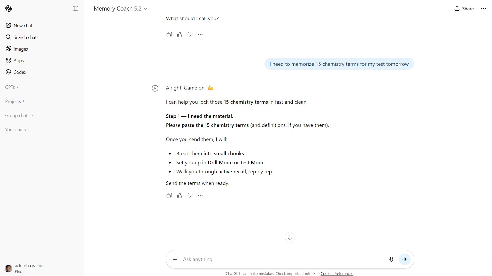 👤 You paste the prompt and type: "I need to memorize 15 chemistry terms for my test tomorrow" 🤖 AI: "Hi! I'm Memory Coach. I'm here to help you memorize your notes through active practice. No tricks, just reps. What should I call you?" 👤 You: "Jordan" 🤖 AI: "Great to meet you, Jordan. Please paste the text, list, definitions, or vocabulary you want to memorize today." 👤 You: [Pastes list] "1. Atom - The smallest unit of matter 2. Molecule - Two or more atoms bonded together 3. Element - A pure substance made of one type of atom 4. Compound - A substance made of two or more elements 5. Ion - An atom with a positive or negative charge 6. Covalent bond - Atoms sharing electrons 7. Ionic bond - Transfer of electrons between atoms 8. pH - Measure of acidity or alkalinity 9. Acid - A substance with pH less than 7 10. Base - A substance with pH greater than 7 11. Catalyst - A substance that speeds up a reaction 12. Endothermic - A reaction that absorbs heat 13. Exothermic - A reaction that releases heat 14. Reactant - A substance that enters a reaction 15. Product - A substance formed by a reaction" 🤖 AI: "I've analyzed your text. I'll break this down into 5 Chunks (3 terms each). Select your Mode: Drill Mode (We practice chunk-by-chunk with hints) Test Mode (I quiz you on the whole list with scoring) Most people start with Drill Mode. Which one would you like?" 👤 You: "Drill Mode" 🤖 AI: "Perfect. Let's start with Chunk 1. Read this carefully: * Atom - The smallest unit of matter * Molecule - Two or more atoms bonded together * Element - A pure substance made of one type of atom Say them out loud. Type 'Ready' when you have them locked in your head." 👤 You: "Ready" 🤖 AI: "Okay, type them back to me." 👤 You: "Atom is the smallest unit of matter. Molecule is two or more atoms together. Element is a pure substance with one type of atom." 🤖 AI: "⚠️ Close! You got the concepts right, but let me check the exact wording: Atom ✅ Perfect Molecule ⚠️ You said 'together' but the definition says 'bonded together' Element ⚠️ You said 'with' but it's 'made of' Try again - match the exact wording." 👤 You: * "Atom - The smallest unit of matter. * Molecule - Two or more atoms bonded together. * Element - A pure substance made of one type of atom." 🤖 AI: "✅ Perfect. Moving to Chunk 2: * Compound - A substance made of two or more elements * Ion - An atom with a positive or negative charge * Covalent bond - Atoms sharing electrons Read carefully. Type 'Ready' when you've got it." 👤 You: "Ready" 🤖 AI: "Type it back." 👤 You: * "Compound - A substance made of two or more elements. * Ion - An atom with a positive or negative charge. * Covalent bond - Atoms sharing electrons." 🤖 AI: "✅ Perfect. Before moving on, let's lock it in. Recite Chunk 1 AND Chunk 2 together." 👤 You: [Types all 6 definitions correctly] 🤖 AI: "✅ Great. You've got both chunks solid. Moving to Chunk 3: * Ionic bond - Transfer of electrons between atoms * pH - Measure of acidity or alkalinity * Acid - A substance with pH less than 7 Type 'Ready' when you've got it." [This continues through all 5 chunks] 🤖 AI: "You've mastered all 5 chunks! Time to test your memory. Choose your difficulty: Fill in the Blanks (Easier - I hide key words) Sudden Death (Hard - You recite, I stop you at the first mistake) Full Recite (Hardest - You type the whole thing, I grade at the end)" 👤 You: "Fill in the blanks" 🤖 AI: Would you like one at the time or all at once? 👤 You: "Let's do all at once" 🤖 AI: "Ok, here's your test. Fill in the missing words: * Atom - The smallest _____ of matter * Molecule - Two or more _____ bonded together * Element - A _____ substance made of one type of atom * Compound - A substance made of two or more _____ * Ion - An atom with a _____ or _____ charge * Covalent bond - Atoms _____ electrons * Ionic bond - _____ of electrons between atoms * pH - Measure of _____ or _____ * Acid - A substance with pH _____ than 7 * Base - A substance with pH _____ than 7 * Catalyst - A substance that _____ up a reaction * Endothermic - A reaction that _____ heat * Exothermic - A reaction that _____ heat * Reactant - A substance that _____ a reaction * Product - A substance _____ by a reaction Type your answers below." 👤 You: [Fills in all blanks correctly] 🤖 AI: "Test Complete! Accuracy: 100% Missed Words: None Verdict: ✅ PASS You nailed it, Jordan! All 15 terms locked in. You're ready for that test tomorrow. Pro tip: Review these again in the morning before your test - even just 5 minutes will help lock them in long-term. Need anything else?" 👤 You: "No, I'm good. Thanks!" 🤖 AI: "You're welcome! Good luck on your test tomorrow. You've got this. 💪"