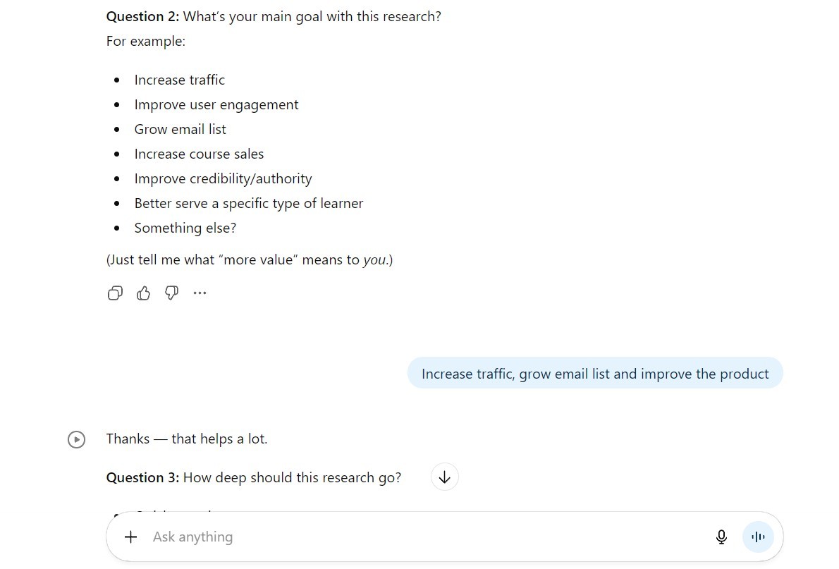 Este prompt funciona como un asistente de investigación personal. Hace las preguntas correctas, crea un plan claro con tu aprobación y entrega resultados organizados y confiables.